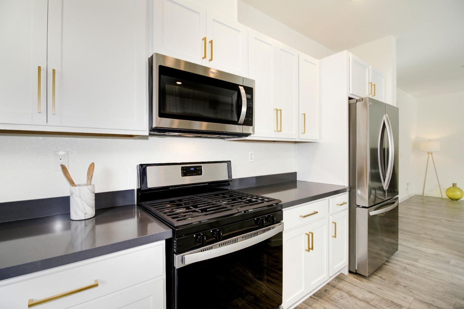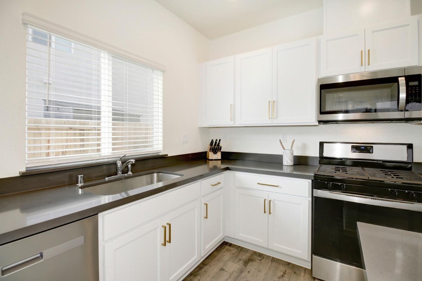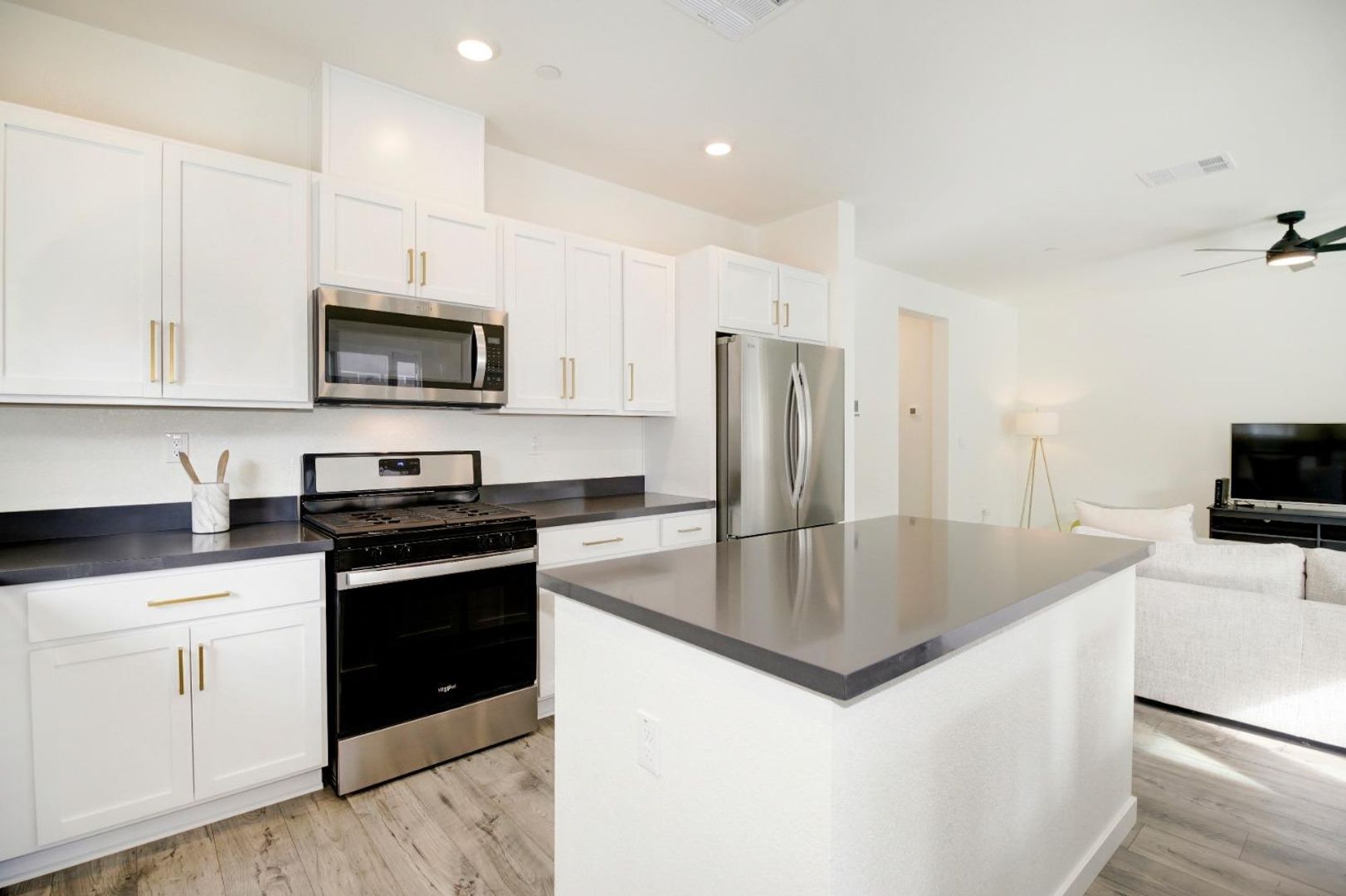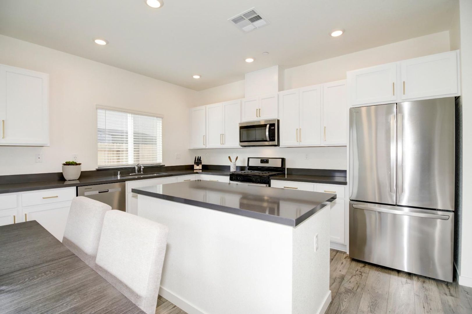 The well-appointed kitchen is a standout feature, offering white cabinetry, elegant gray quartz countertops, and brand-new stainless steel appliances, making cooking and entertaining a breeze. A convenient half bath is also located downstairs.