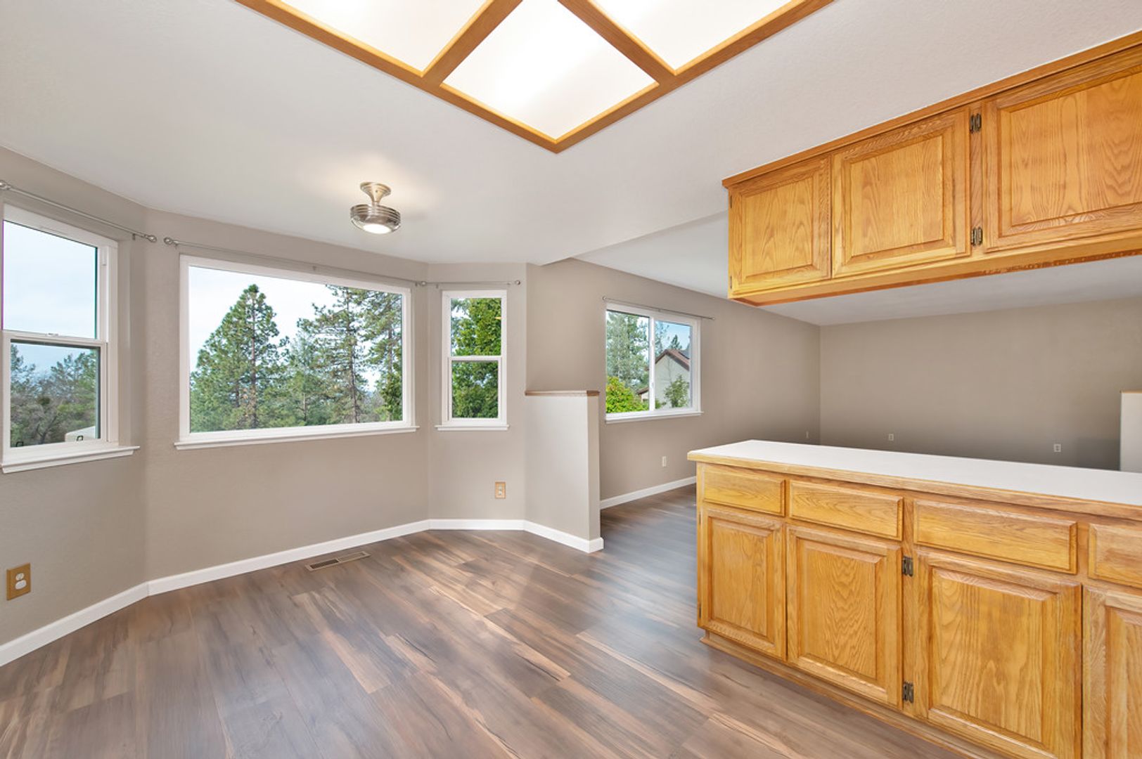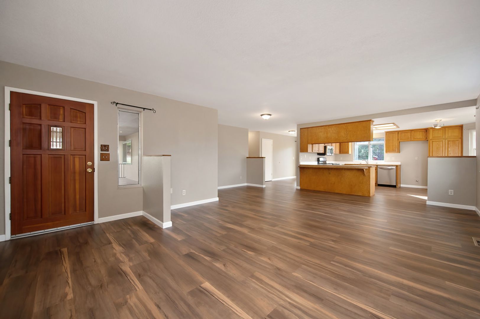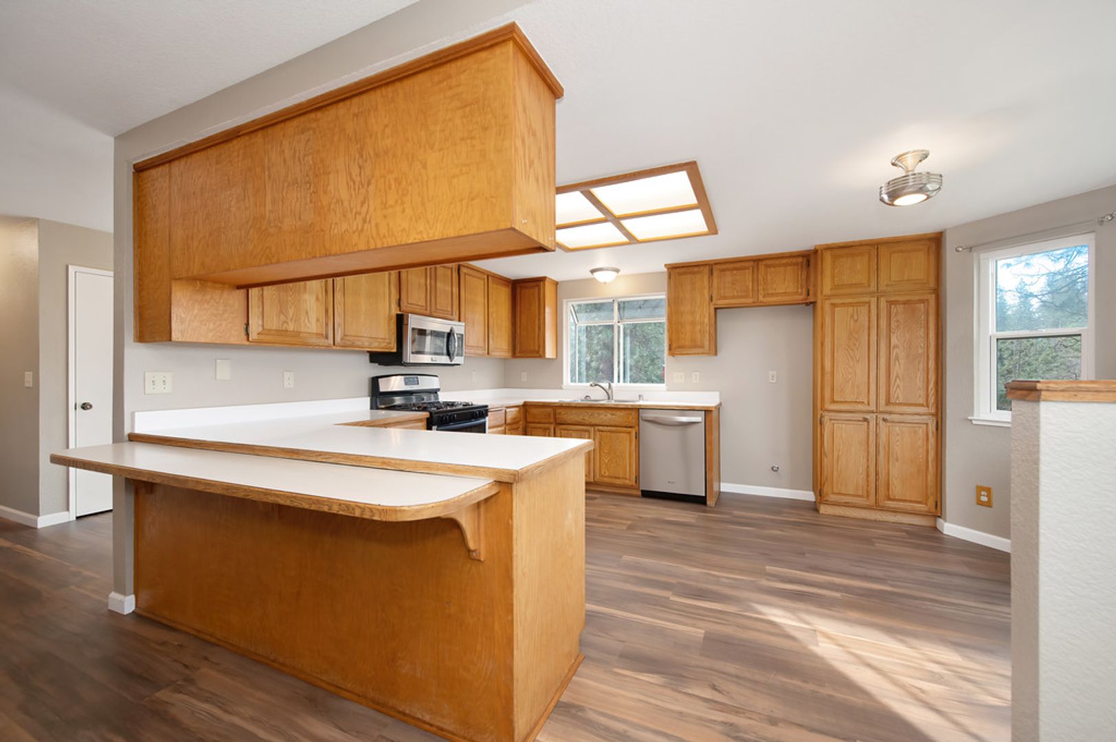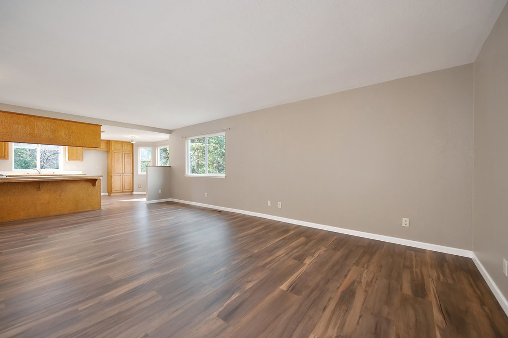 Step inside to find an open concept living space bathed in natural light, with laminate floors throughout that add warmth and character. The large kitchen is perfect for family meals and entertaining, while the airy living room offers a relaxing atmosphere.