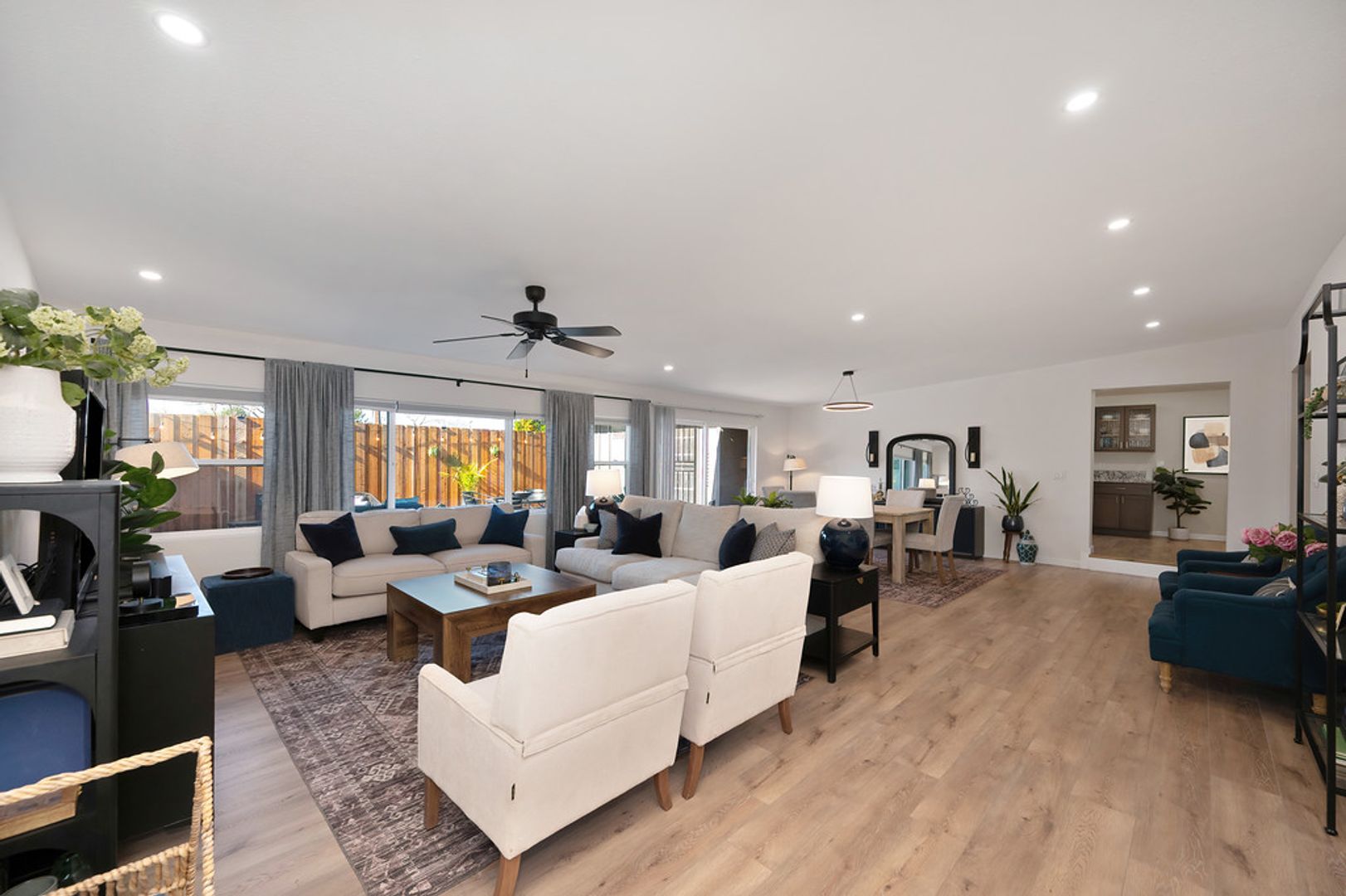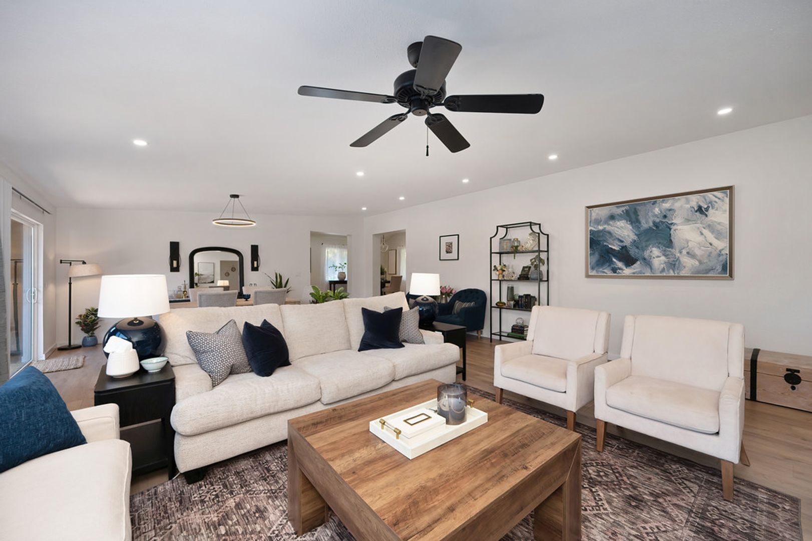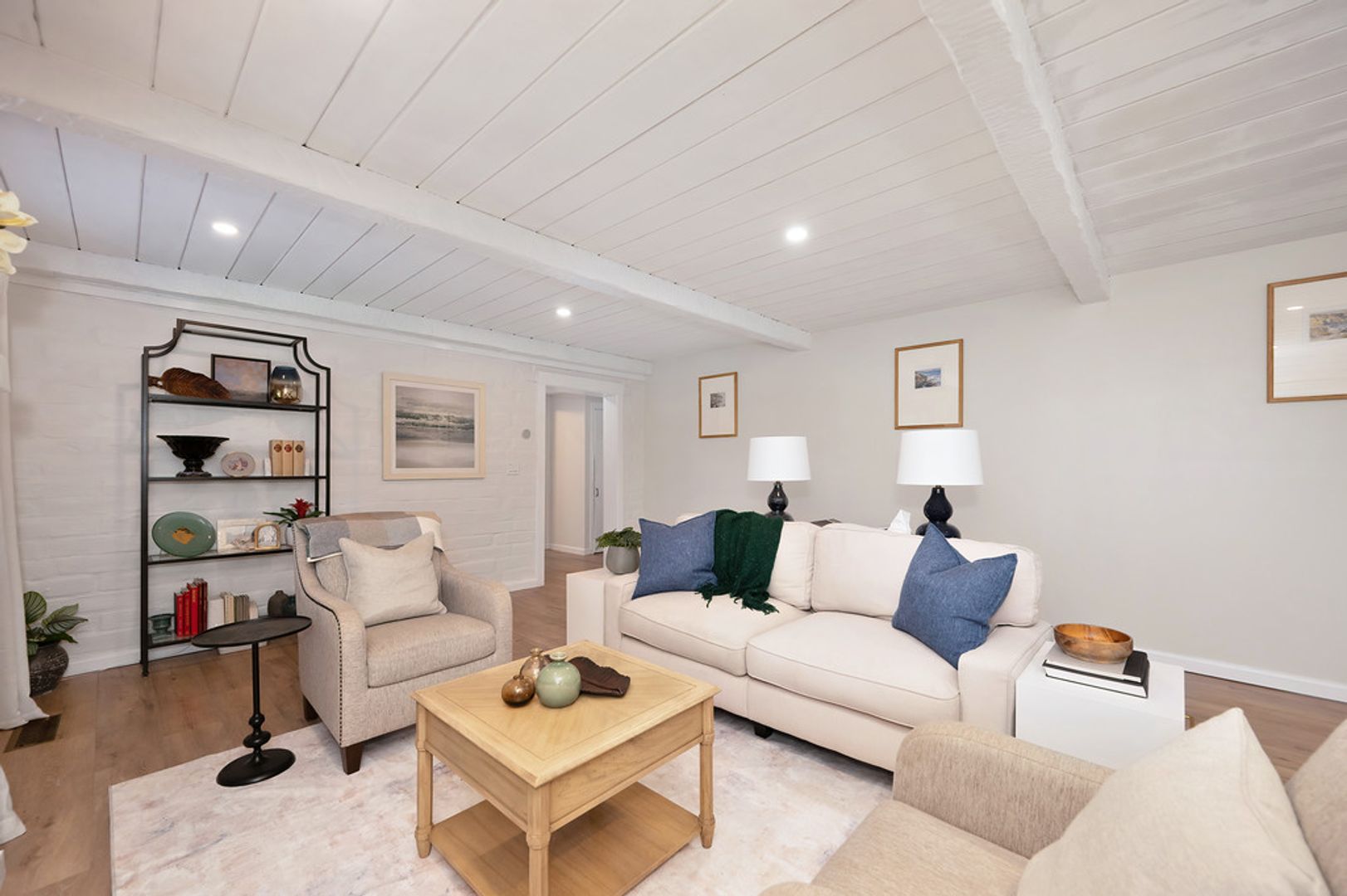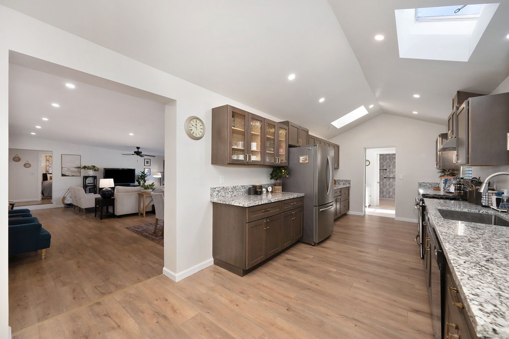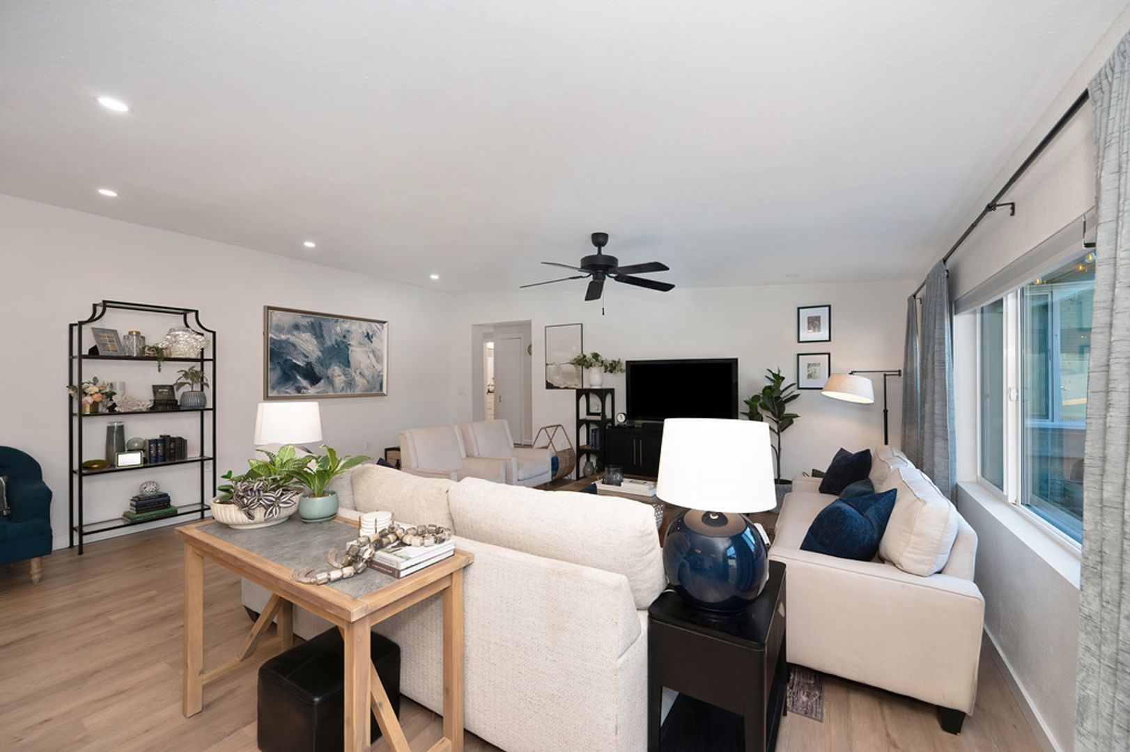 The open, light-filled floor plan features designer flooring, a beautifully updated kitchen with premium cabinetry, sleek countertops, and modern appliances, perfect for both everyday living and entertaining. Both bathrooms have been completely remodeled with spa-inspired finishes, offering a clean, luxurious feel.